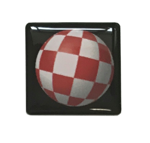 Laminated domed badge is 25mm x 25mm (1 inch x 1 inch) with four beveled corners.
