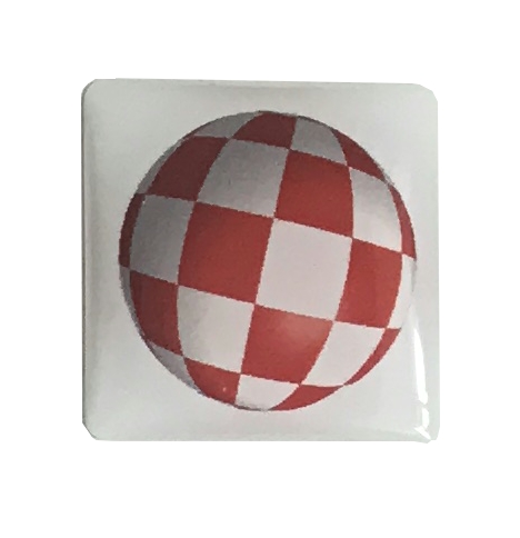 Laminated domed badge is 25mm x 25mm (1 inch x 1 inch) with four beveled corners.