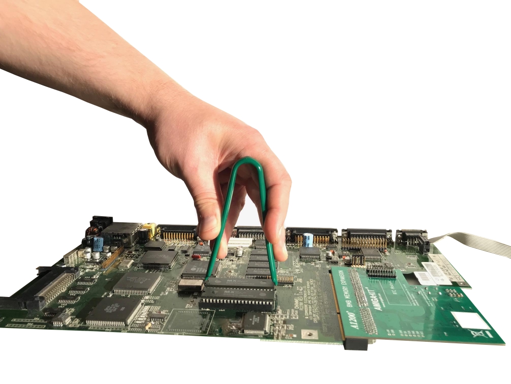 A pair of insulated sprung steel tweezers with hooked ends for removing and placing ICs without making contact with the pins.
